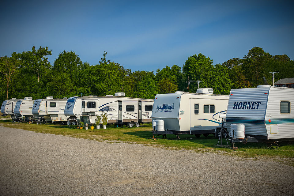 Most RV sites are right on the water and come with full hookups—water, sewer, electricity (30 A and 50 A), and free Wi‑Fi.