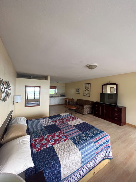 Our 23-suite lodge and RV park offers spacious 450 sq. ft. units with pine furnishings, king or double-queen beds, mini-fridges, microwaves, coffee makers, cable TV, WiFi, and waterfront views from every room. All rooms are non-smoking, with two pet-friendly options available. A designated swimming area and pavilion make it perfect for family reunions, weddings, birthdays, and special events.